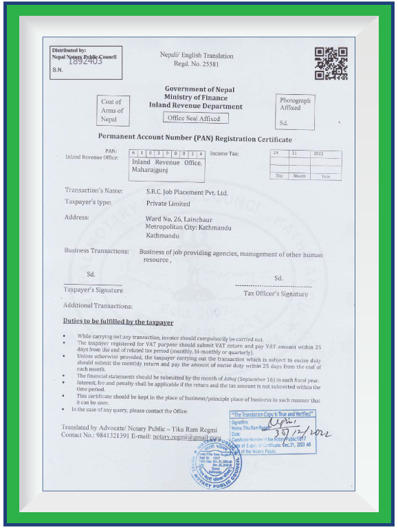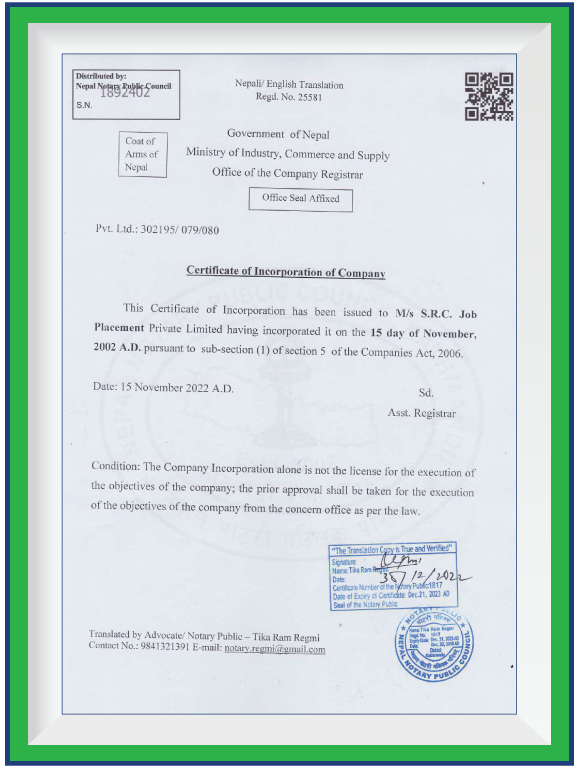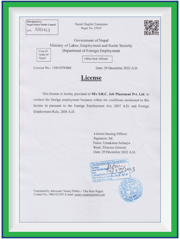 As a reputable and ethical recruitment agency, S.R.C Job Placement Pvt. Ltd. is proud to be associated with the Government of Nepal, Ministry of Labour & Employment, and the Secretarial of Foreign Employment Promotion Board. With License Number 1585/079/80 , we are dedicated to upholding professionalism and ethical recruitment practices in the industry.